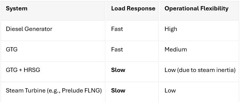 Steam-based systems, including GTG + HRSG and steam turbines, have high inertia, making them less responsive and harder to manage during shutdowns or partial loads.