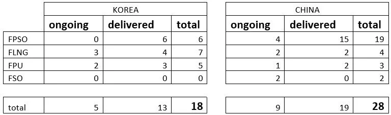 Floating Production Units (FPUs) share many similarities with FPSOs but are typically deployed for gas fields without storage capability. Both Korea and China are active in this segment.