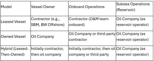 In both models, the oil company retains responsibility for subsea operations, including reservoir management, well intervention, and flow assurance. This is due to their role as the field operator, which includes regulatory accountability and production optimization. Onboard operations, however, differ significantly: leased vessels are typically operated by the contractor, while owned vessels may be operated directly by the oil company or outsourced to a specialized O&M provider. Hybrid models begin with contractor-led operations and transition to company-led control upon transfer of ownership.