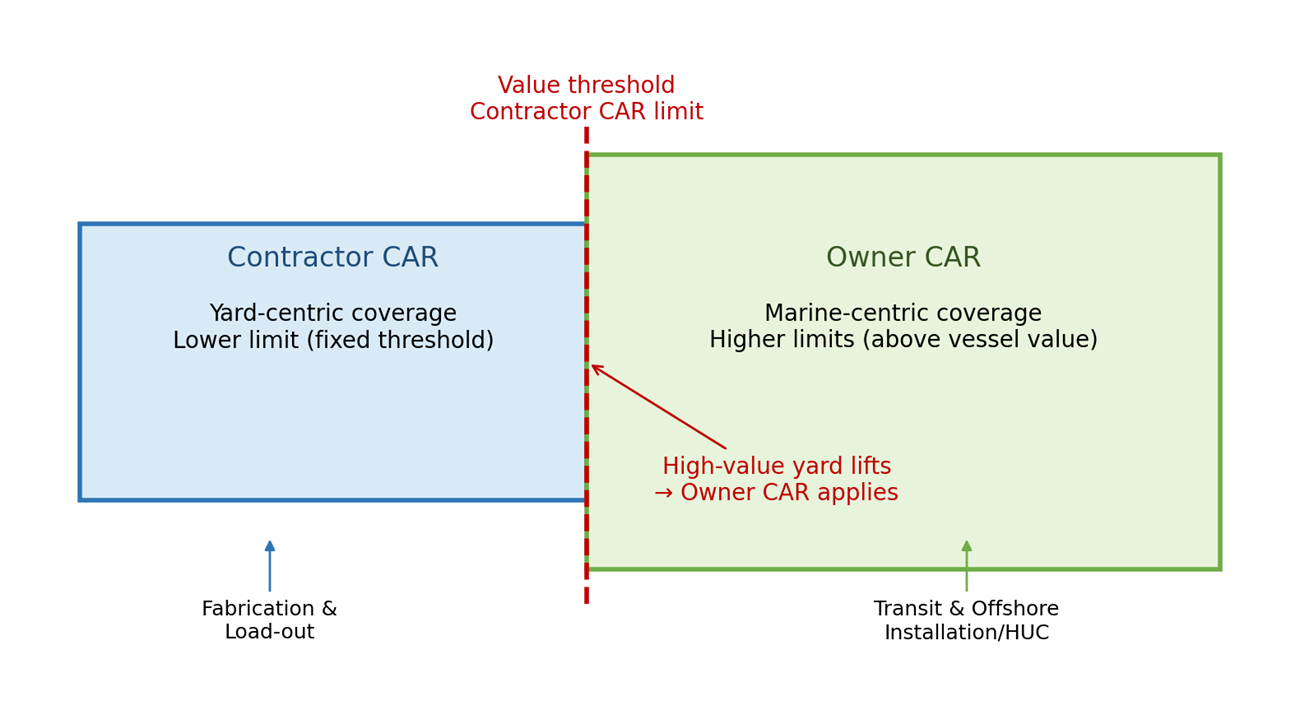 Owner’s CAR (marine‑centric, higher limits): This placement addresses high‑severity exposures from long‑haul transit and offshore operations (tow, installation, hook‑up, commissioning) and is configured with much higher limits, often set above the vessel’s insured value to capture catastrophic scenarios during marine operations. Importantly, the owner’s CAR also engages for high‑value yard lifts when the item value crosses the contractor’s threshold, even if the operation occurs within the yard.