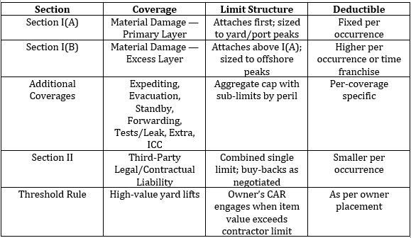 Material damage is often structured in layers: a primary layer (Section I(A)) sized to yard/port exposures and one or more excess layers (Section I(B)) aimed at peak exposures during offshore installation and critical heavy‑lift phases. Additional coverages are commonly aggregated under an overall cap with sub‑limits by peril—expediting expenses, evacuation expenses, standby charges, forwarding charges, tests/leak search, extra expenses, and increased cost of construction mandated by regulation.