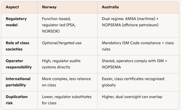Norway’s model emphasizes a strong, function‑based regulatory regime rather than default reliance on a ship‑type class certificate. Key features of that model: